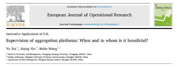近日,重庆交通大学经济与管理学院夏宇博士以第一作者身份在国际权威期刊European Journal of Operational Research在线刊发了研究成果“Supervision of aggregation platforms: When and to whom is it beneficial?”。该论文由重庆交通大学夏宇博士、上海财经大学谢吉青博士和上海商学院王博霖博士合作完成,第一完成单位为重庆交通大学经济与管理学院。