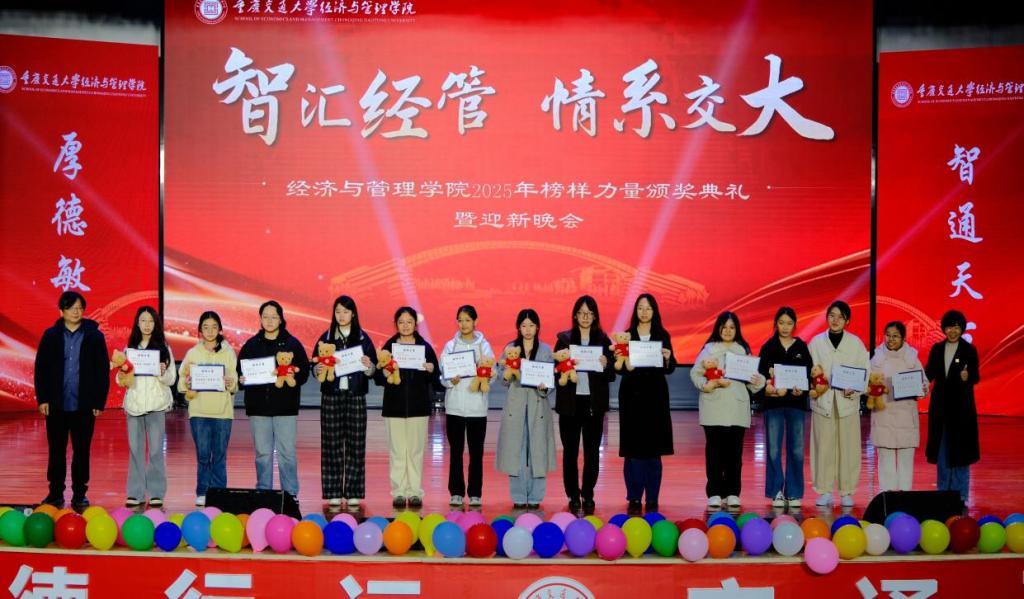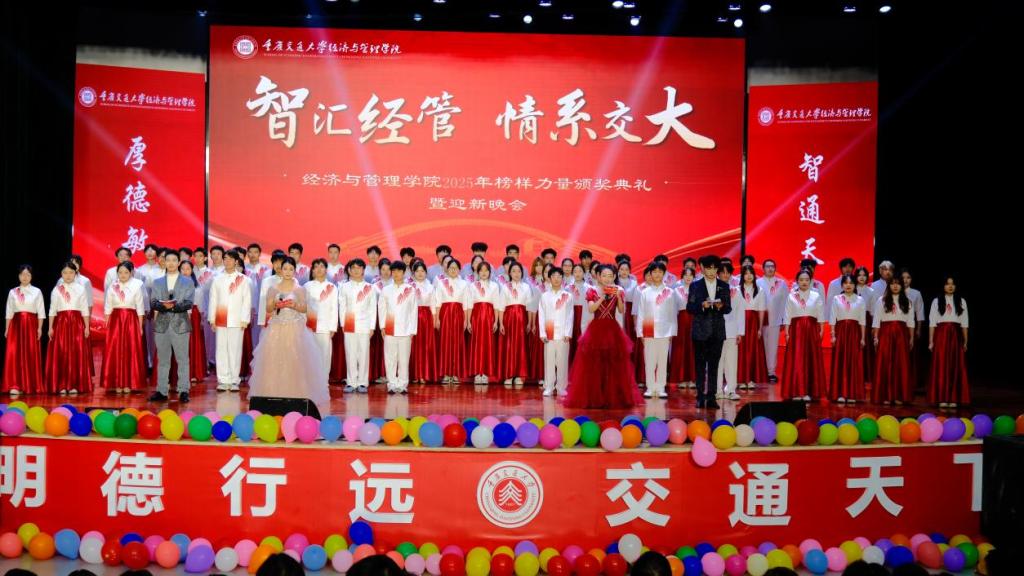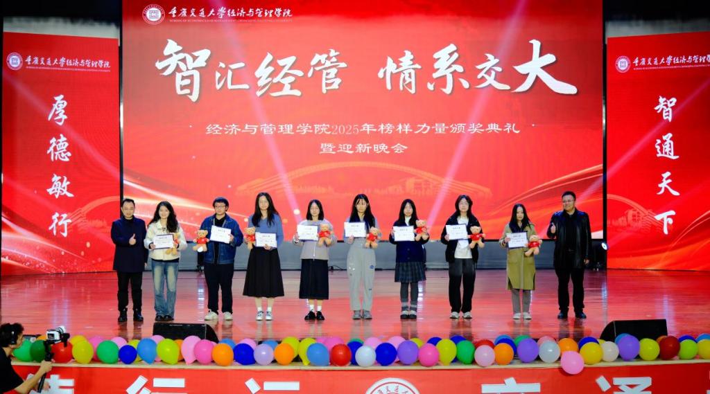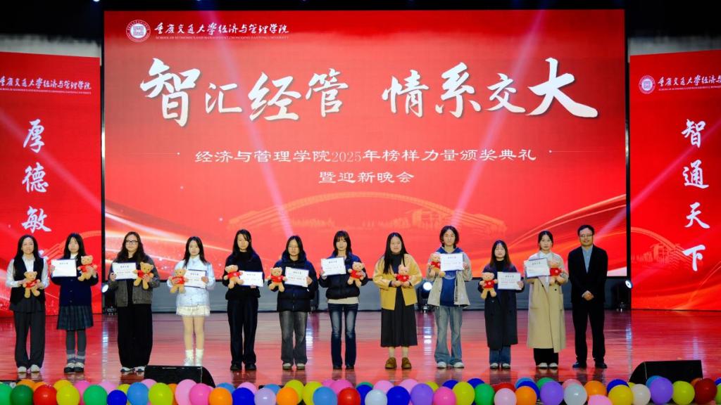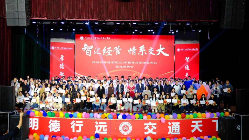 2025年11月30日18:30,重庆交通大学科学城校区学生活动中心二楼学术报告厅灯火璀璨,“智汇经管,情系交大”——经济与管理学院2025年榜样力量颁奖典礼暨迎新晚会隆重举行。党委学生工作部副部长金春寒、校团委副书记揭财明、科学城学院副院长陈先宇、经管学院党委书记尹作发、院长李红镝、党委副书记吉孟君、副院长李豪、副院长张子健、各系教师代表以及700余名学生齐聚一堂,共同见证这场以榜样为核心的青春盛宴。