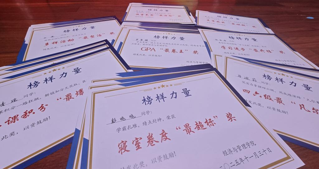 本次颁奖典礼打破传统单一的表彰模式,以8类特色奖项、超50位学子(含集体)的“青春实力答卷”,全方位勾勒出经管学子的多元优秀特质。夏艺嘉等20位学子获评GPA“最卷王”奖,其中孙彩芸4.49分、张义娟4.44分的高分绩点诠释深耕精神;宋朝冉(2103.6分)、王靖瑶(1387.2分)等凭超千分二课积分拿下“最爆棚”奖,彰显全面发展活力;周思扬、马迎莉以四六级高分获评“最凡尔赛”奖,展现扎实语言素养;唐滋岭、余淋等9人凭国家级竞赛佳绩获“最硬核”奖,凸显学科实践实力;德园4栋507宿舍以全员高绩点的亮眼表现,将寝室卷度“最超标”奖收入囊中;德园4栋512和639宿舍凭借其和谐友爱、积极向上的氛围获“最治愈”奖;徐佳玮凭借其跨越式的成绩及提升,一举拿下学习进步“最开挂”奖,展现出惊人的潜力;余豪、日孜宛·麦麦提、李文润和崔敏四位同学在各类活动中创意频出,获得多样活动“最整活”奖,为校园注入了无限活力。颁奖分三轮有序进行,与会领导分批颁奖,每轮聚焦一类特质,从生活成长到集体力量,从学业标杆到竞赛先锋,让每个优秀故事被清晰看见,引发新生强烈共鸣。