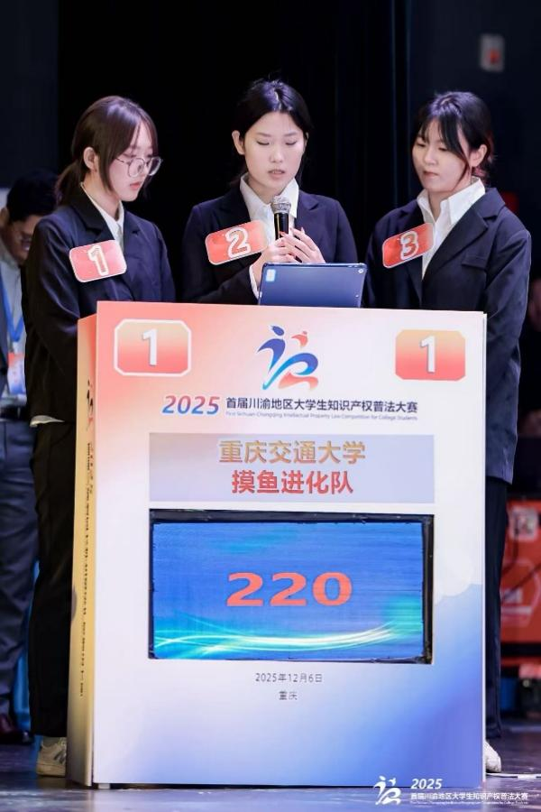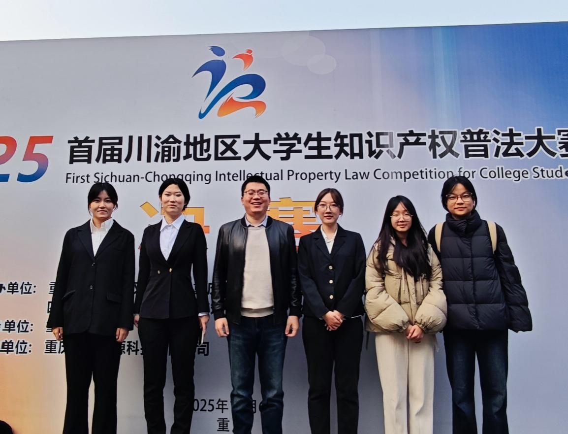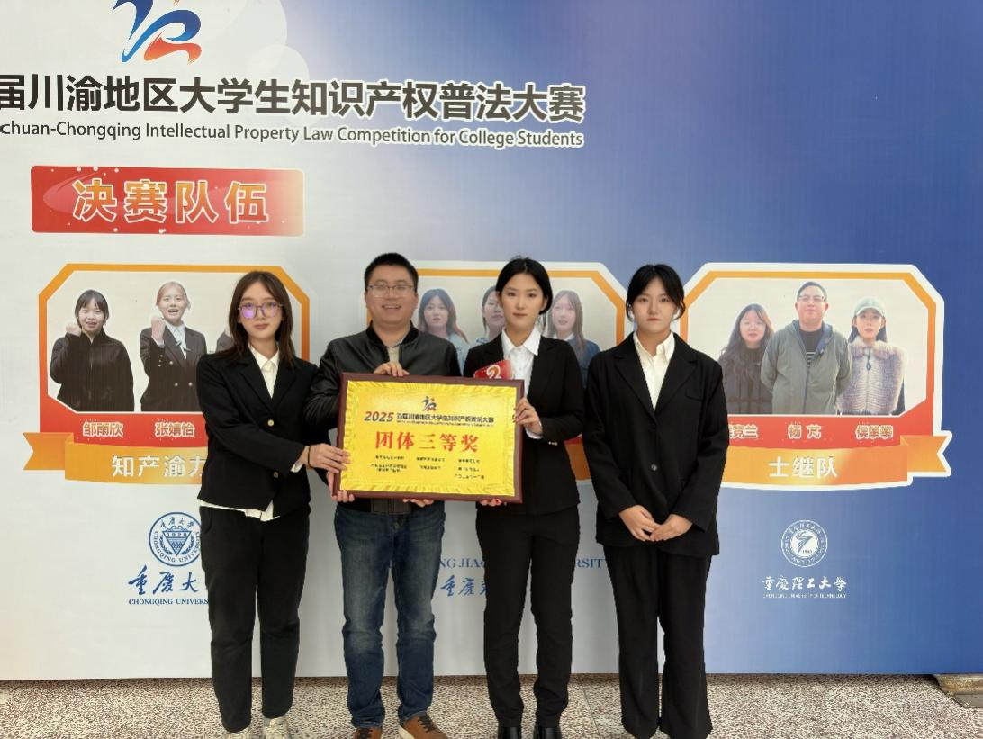 2025年12月6日,首届川渝地区大学生知识产权普法大赛在重庆大学圆满落幕。本次大赛由重庆市知识产权局、重庆市教育委员会、重庆市司法局、四川省市场监督管理局(省知识产权局)、四川省教育厅、四川省司法厅等六部门共同主办。我校代表队凭借扎实的专业功底与默契的团队协作,从川渝地区118所高校中脱颖而出,成功晋级决赛,并最终以主观题第一、总排名第六的成绩荣获大赛三等奖和最佳风采奖。