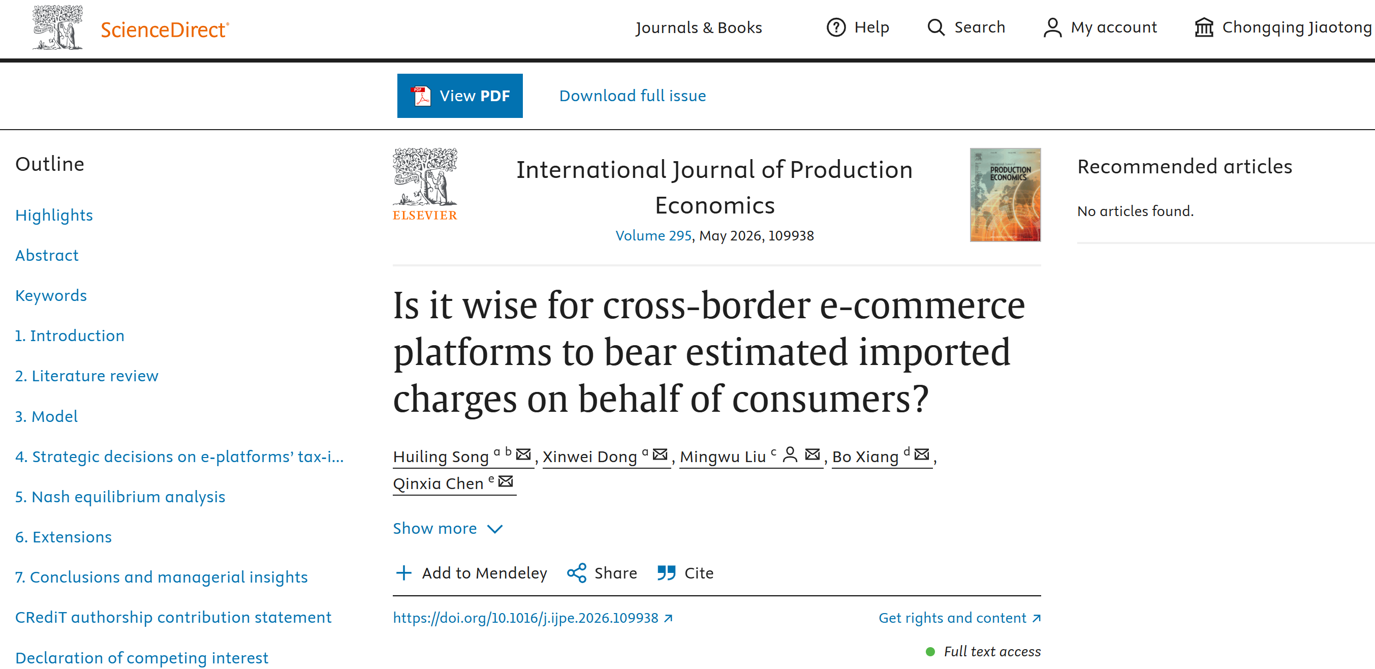 Huiling Song, Xinwei Dong, Mingwu Liu*, Bo Xiang, Qinxia Chen, Is it wise for cross-border e-commerce platforms to bear estimated imported charges on behalf of consumers?, International Journal of Production Economics, Volume 295, 2026, 109938, https://doi.org/10.1016/j.ijpe.2026.109938.