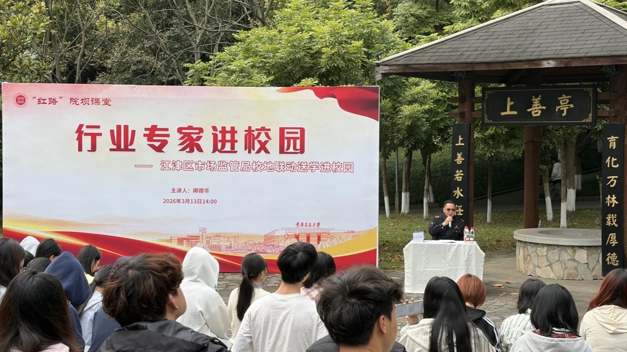 近日,重庆交通大学经济与管理学院持续深化法治教育实践,特邀江津区市场监督管理局相关工作人员卿德华,走进“红路”院坝课堂,在重庆交通大学科学城校区“古井·2011”文化庭院,开设知识产权专题普法讲座。