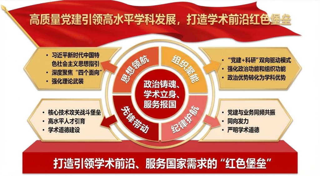 党支部以习近平新时代中国特色社会主义思想为指引,深度聚焦“四个面向”,坚持“政治铸魂、学术立身、服务报国”。以强化政治功能和组织功能为重点,构建“党建+科研”双向驱动模式,通过“思想领航、组织聚能、先锋带动、纪律护航”,将党组织的政治优势转化为学科发展的竞争优势。支部致力于在核心技术攻关、高水平人才引育、学术道德建设中发挥战斗堡垒作用,推动党建工作与业务工作同频共振、同向发力,打造引领学术前沿、服务国家需求的“红色堡垒”。